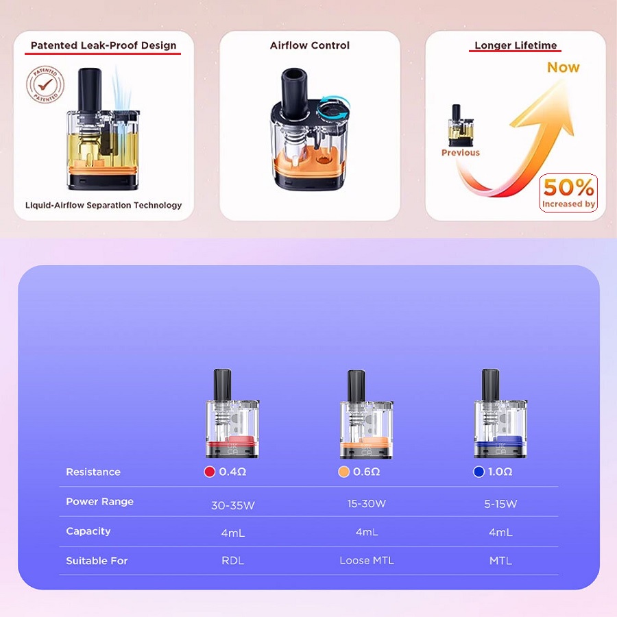 Οι νέες δεξαμενές προσφέρουν ακόμα πιο πλούσια γεύση και ατμό, ενώ έχουν ειδική πατέντα στην κατασκευή για μηδέν διαρροές και βελτιωμένη αντίσταση για μεγαλύτερο χρόνο ζωής!